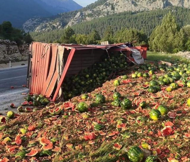 Antalya’nın İbradı-Akseki yolu Düzlen Mahallesi yakınlarında, karpuz yüklü bir kamyon şarampole devrildi. Kazada sürücü yara almadan kurtuldu. Kamyonun, Antalya’dan yüklenen karpuzları Adana’ya götürdüğü, ancak navigasyonun yanlış yönlendirmesi sonucu İbradı üzerinden Akseki yoluna girdiği belirtildi. Demirkapı Tüneli’ni geçtikten sonra rampa aşağı inerken direksiyon hakimiyetini kaybeden sürücünün aracı devrilirken, tonlarca karpuz yol kenarına savruldu.