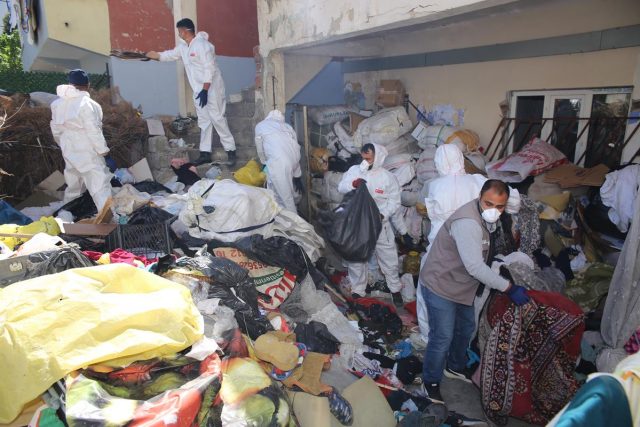 Belediye Zabıta İşleri Müdürlüğü, Belediye Fen İşleri, Temizlik İşleri, Çevre Koruma ve Kontrol Müdürlüğü ekipleri ile birlikte çöplerin tahliyesine başladı. Çöp evden 2 kamyon (20 ton) çöp çıkartan Belediye ekipleri çöplerin tamamen tahliyesinden sonra Veterinerlik İşleri Müdürlüğü evde ilaçlama ve dezenfekte işlemi gerçekleştirdi.