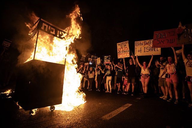 Tel Aviv’deki protestoların başlıca adreslerinden olan ve polisin demir bariyerlerle kapattığı Kaplan Caddesi’ndeki gösteriye katılan on binlerce İsrailli de Gazze’deki esirlerin serbest bırakılması için takas anlaşmasının derhal yapılması talebinde bulundu.